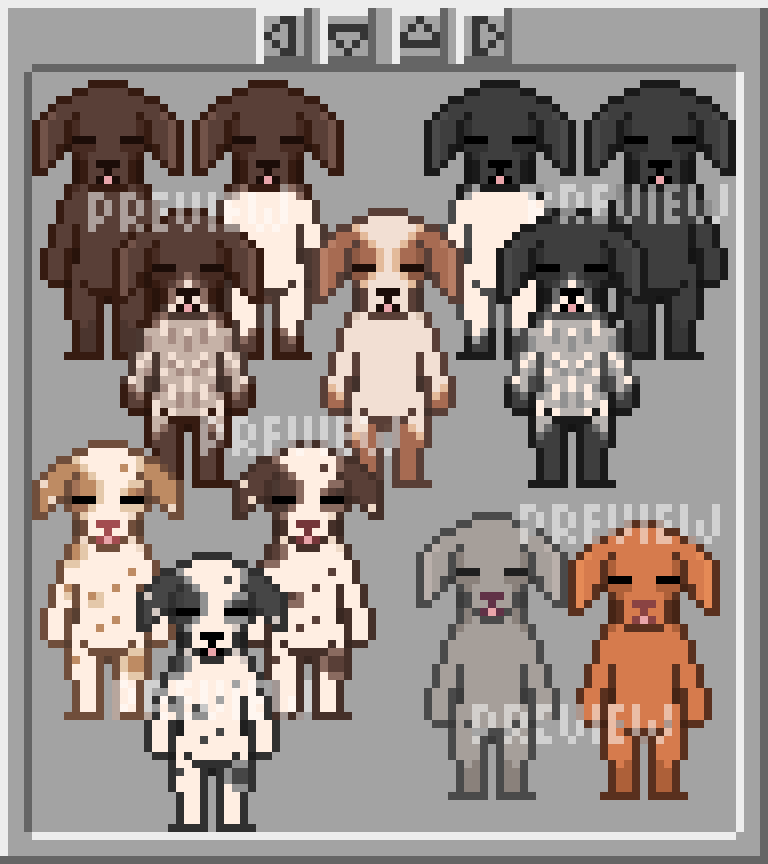 This pack features animated dogs in 12 variations - pointers & dalmatians with varying coat colors + the orange vizsla and grey weimaraner. The sprite size is 32X36 pixels for every character except the weimaraner that is 32X38 . Use as NPCs, monsters or playable characters in your game.